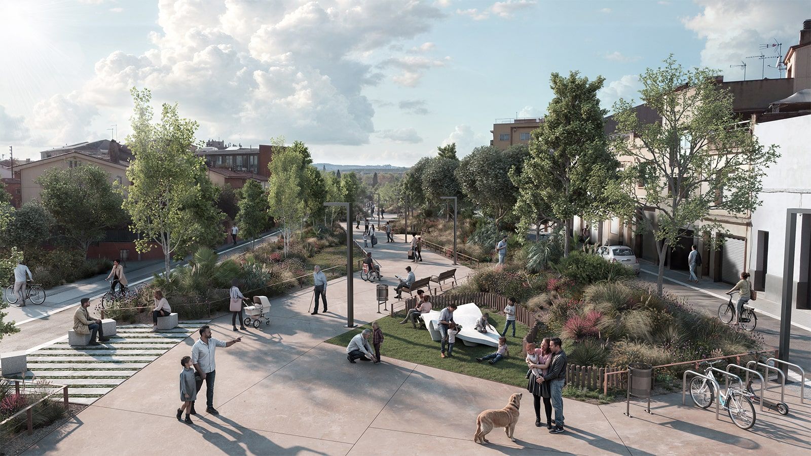 L’espai es concep com un passeig naturalitzat, amb superfícies permeables, vegetació autòctona i jardins de pluja que milloren la gestió de l’aigua i la biodiversitat. L’àmbit s’organitza en franges de passeig, estada i vegetació, combinant zones ombrejades, àrees de jocs i espais per a activitats esportives i culturals.